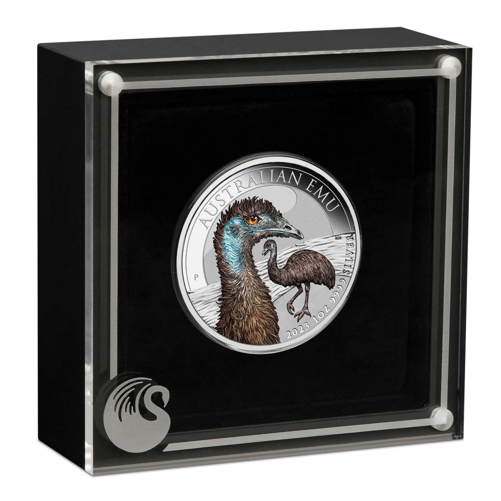 This beautifully coloured coin features a close-up depiction of an adult emu attentively watching over its chicks, set against a stylised river backdrop. The design also includes the inscription “AUSTRALIAN EMU”, The Perth Mint’s ‘P’ mintmark, the 2023 year-date, and the coin’s weight and purity.