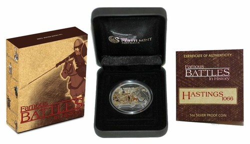Own a piece of history with this striking 1oz silver proof coin commemorating the legendary Battle of Hastings. Issued as part of the popular Famous Battles in History series and produced by the Perth Mint.