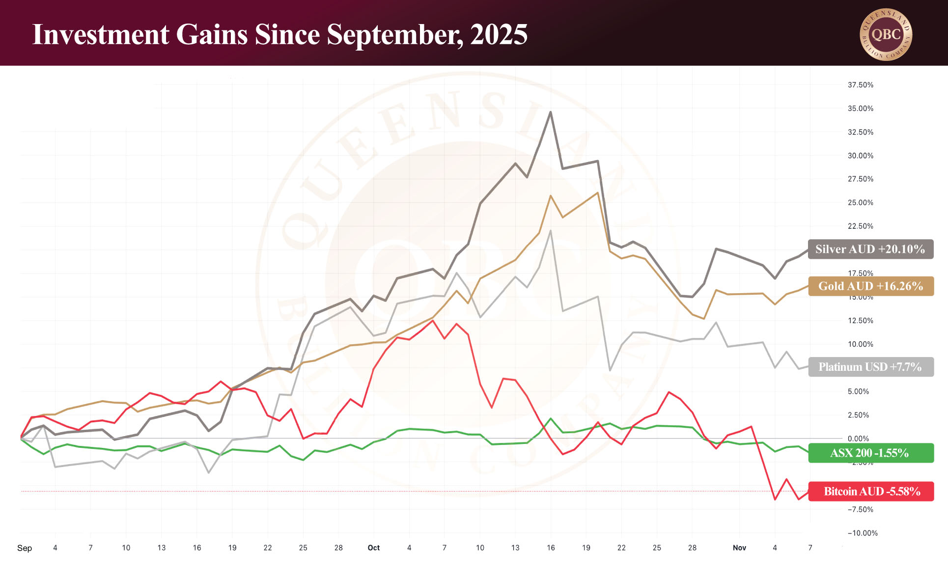 Since early September silver has risen 26%, even with the latest correction. Measured from January 2024, its price has more than doubled from AUD $34.30 to AUD $74.54, a 116% increase. Importantly it has achieved this without a major global downturn. That alone is telling. Historically, silver rallies have been reactive — responses to crises. This time, gold and silver is leading. It is rallying ahead of the correction, not because of it.